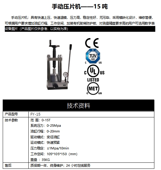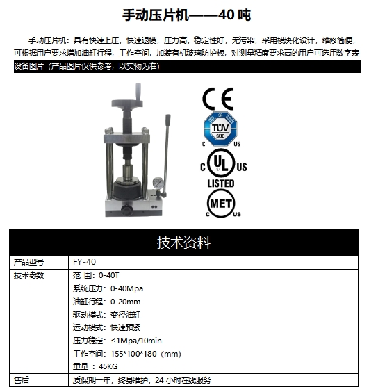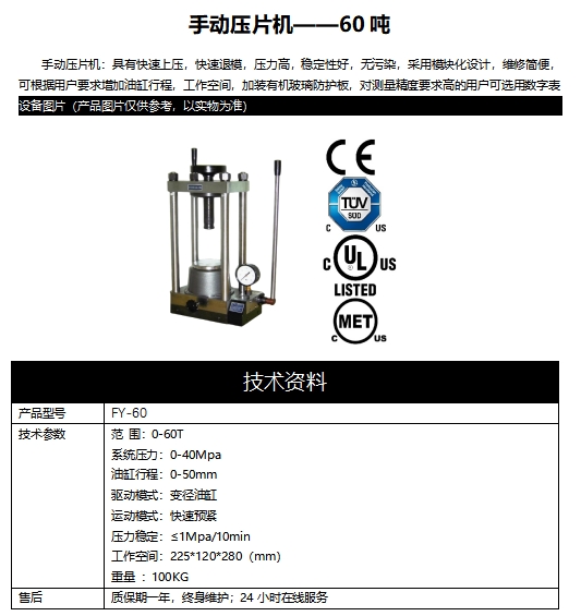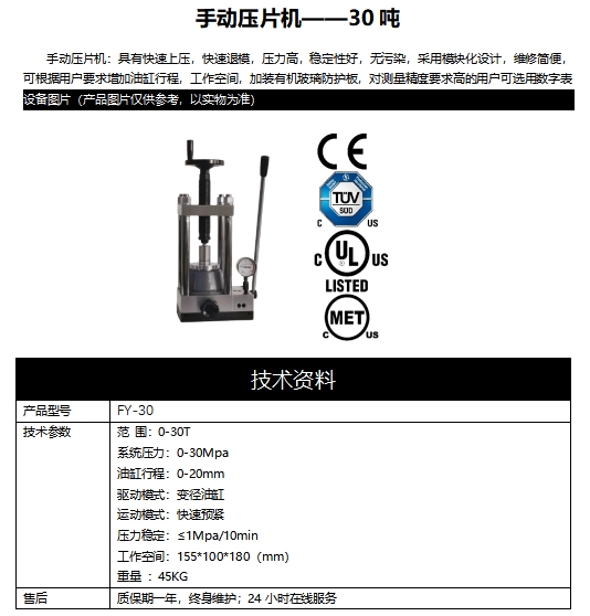 手動壓片機:具有快速上壓,快速退模,壓力高,穩(wěn)定性好,無污染,采用模塊化設計,維修簡便,可根據(jù)用戶要求增加油缸行程,工作空間,加裝有機玻璃防護板,對測量精度要求高的用戶可選用數(shù)字表